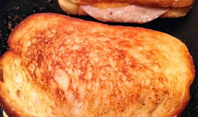 Layer the bread slices in the pan to brown on one side for 1-2 minutes. Flip the slices adding more butter to the surface of the pan. Place 2 slices of cheese on each bread slice.